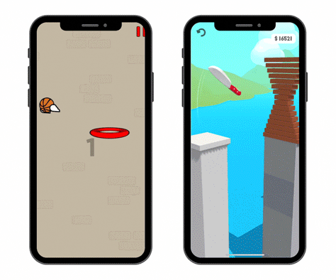 过去两年,Tummy经常和Voodoo发行团队沟通,参与头脑风暴会议和培训课程。经过对过往热门超休闲游戏的广泛研究,我们的一位发行经理发现,经典超休闲手游《Flappy Dunk》(下图图左,2017)在问世几年后仍然拥有20%左右的7日留存率,数据相当不错。我们意识到,这表明计时点击机制在超休闲游戏中非常有价值。因此,发行团队决定采用“改变玩具,延续规则”的指导方针,建议Tummy结合流行趋势开发一款新作,让该机制变符合现代玩家的喜好。