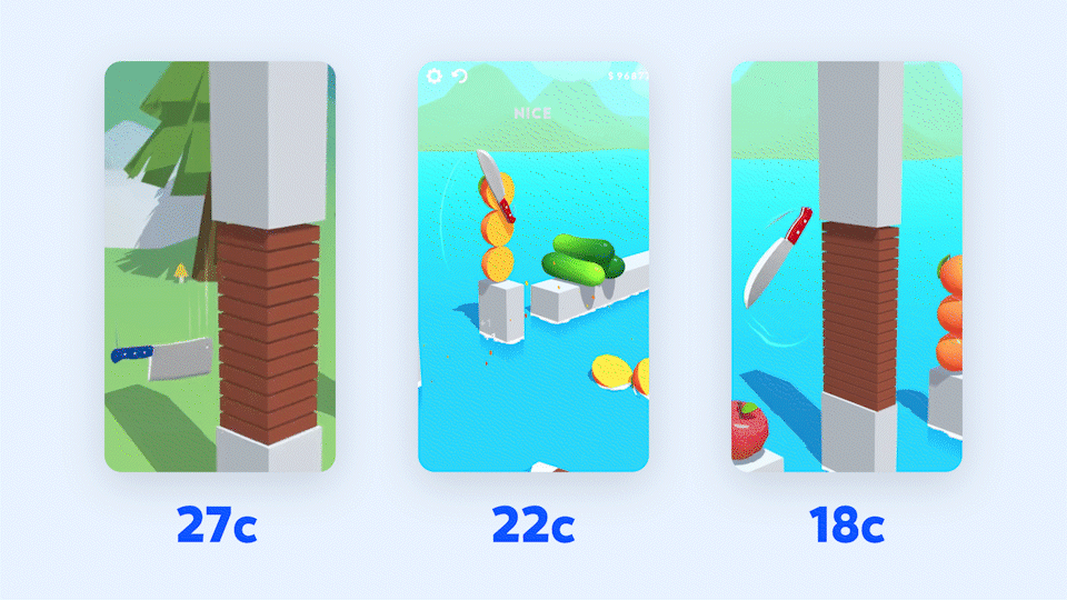 《切割一切》的早期测试数据不错,开发团队对其核心玩法很有信心,相信它能够成为爆款产品。不过,Tummy和Voodoo发行团队仍然决定进一步降低游戏的CPI,以提升游戏的买量潜力。围绕这个目标,我们做了些简单却非常有效的调整,成功地将CPI从27美分拉低到22美分,最后一次测试更降至18美分。