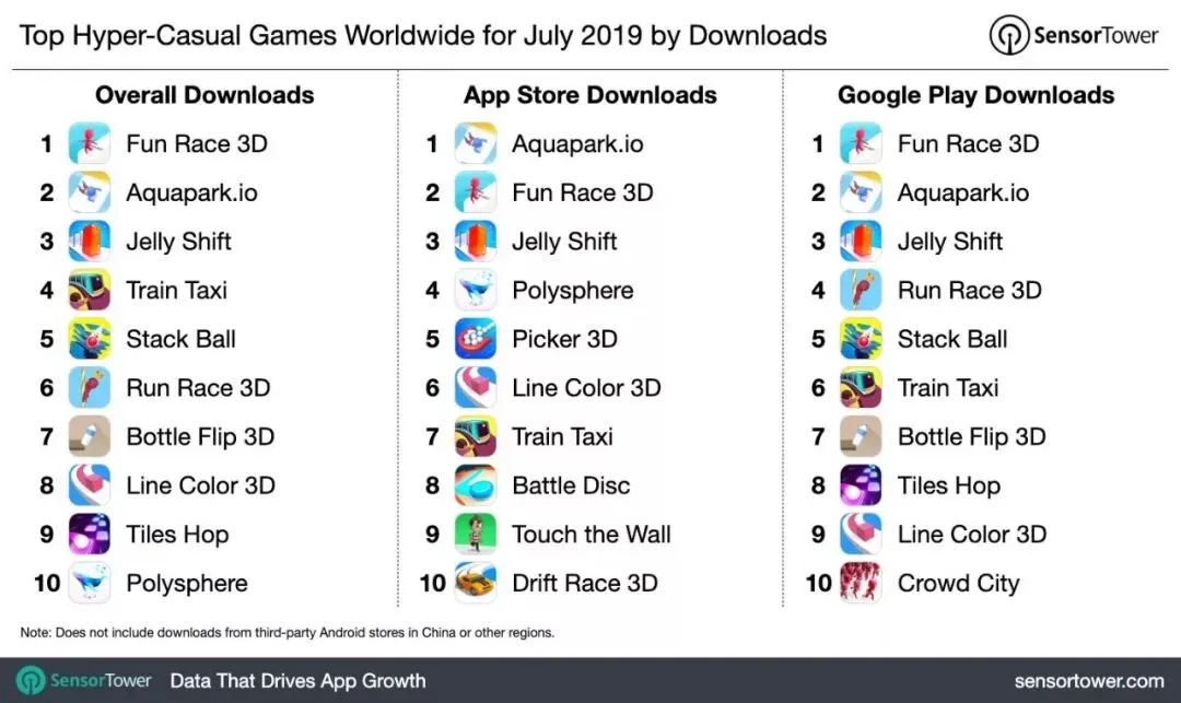 近日,知名数据机构Sensor Tower公布了2019年7月全球超休闲游戏下载排名,其中综合排名中位列TOP5的分别是《Fun Race 3D》、《aquapark.io》、《Jelly Shift》、《Train Taxi》和《Stack Ball 3D》,其中发行时间最早的《aquapark.io》也才上线不到半年,剩下的几款游戏均是6月左右相继上线,这也较为符合行业对于超休闲游戏的预估。