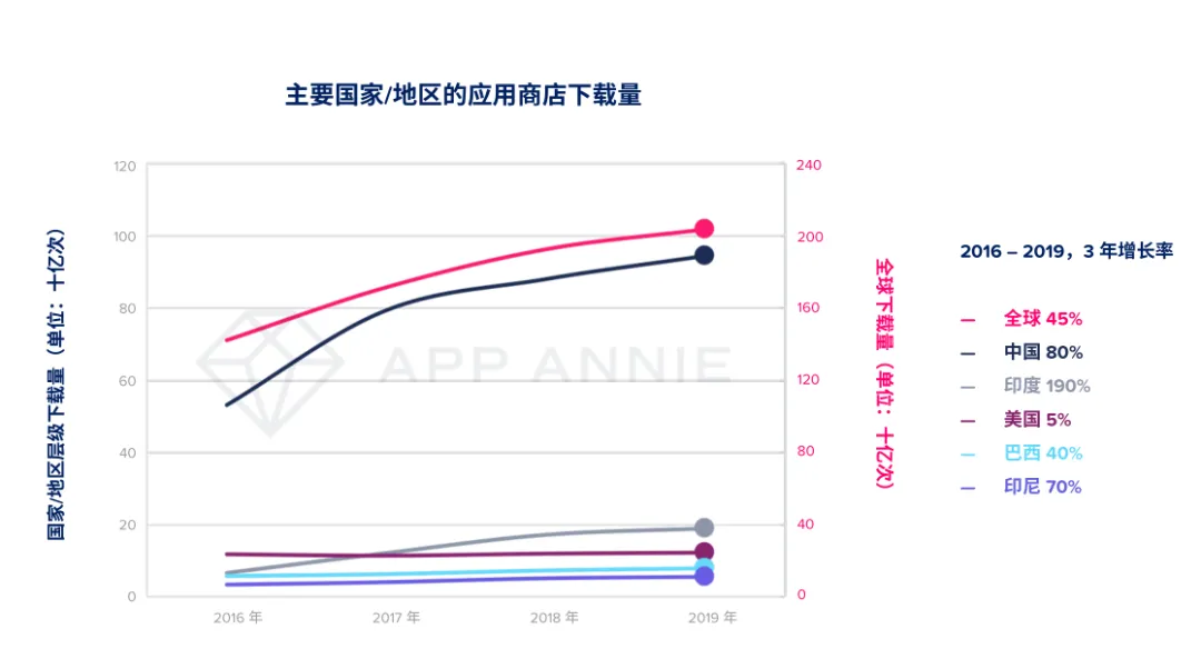 全球App下载量在2019年创下了新的记录达到2040亿次,从2016年起,排除重新安装的更新量,全球App下载量在3年内增长了45%,其中由印度、巴西和印度尼西亚领衔的新兴市场成为主力,印度的下载量3年内增长率达190%,印尼达到70%、巴西达到40%,此外中国也达到了80%的增长率。