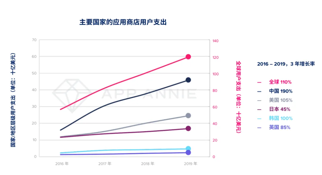 根据报告显示,美国的应用商店用户支出3年的增长率为105%、韩国为100%、日本为45%以及英国达到85%。另外,中国仍然是全球用户最大支出市场,占比高达40%。