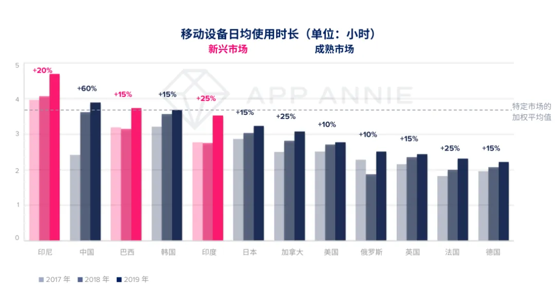 移动设备已成为人们日常生活中不可或缺的产品,2019年全球用户的移动设备(Android手机)每日使用市场达到3小时40分钟,较前2年相比增加35%。其中印尼、巴西和印度等新兴市场移动App日均使用市场仍然较高,而法国、印度和加拿大的移动App使用市场也出现强劲的增长,2019年与2017年相比增长25%。