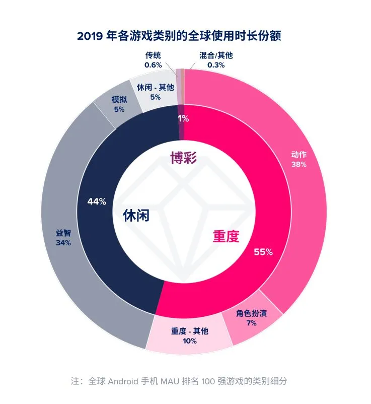 重度游戏的下载量占比虽然只有18%,但是使用时长却居高不下,在2019年各类游戏的全球使用时长占比中,以重度达到55%,其中动作类游戏占比最高达到38%,角色扮演类达到7%。