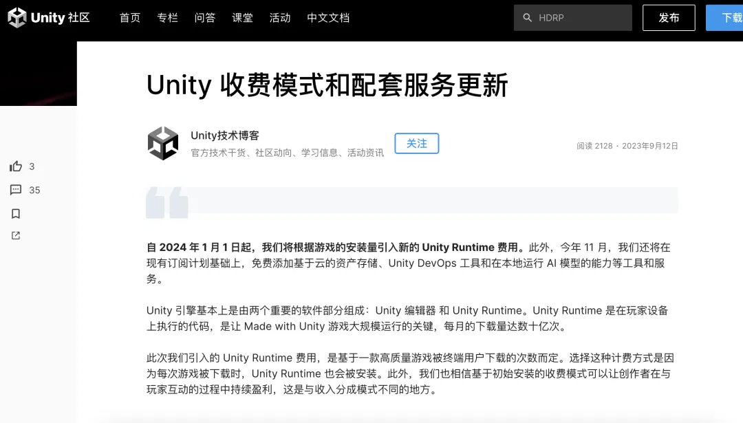 9月12日晚,游戏引擎厂商Unity在官网发布公告称,将从2024年1月1日开始向符合条件的游戏产品征收运行时费用“Unity Runtime Fee”,按安装量单次收费,价格区间为0.01-0.2美元。