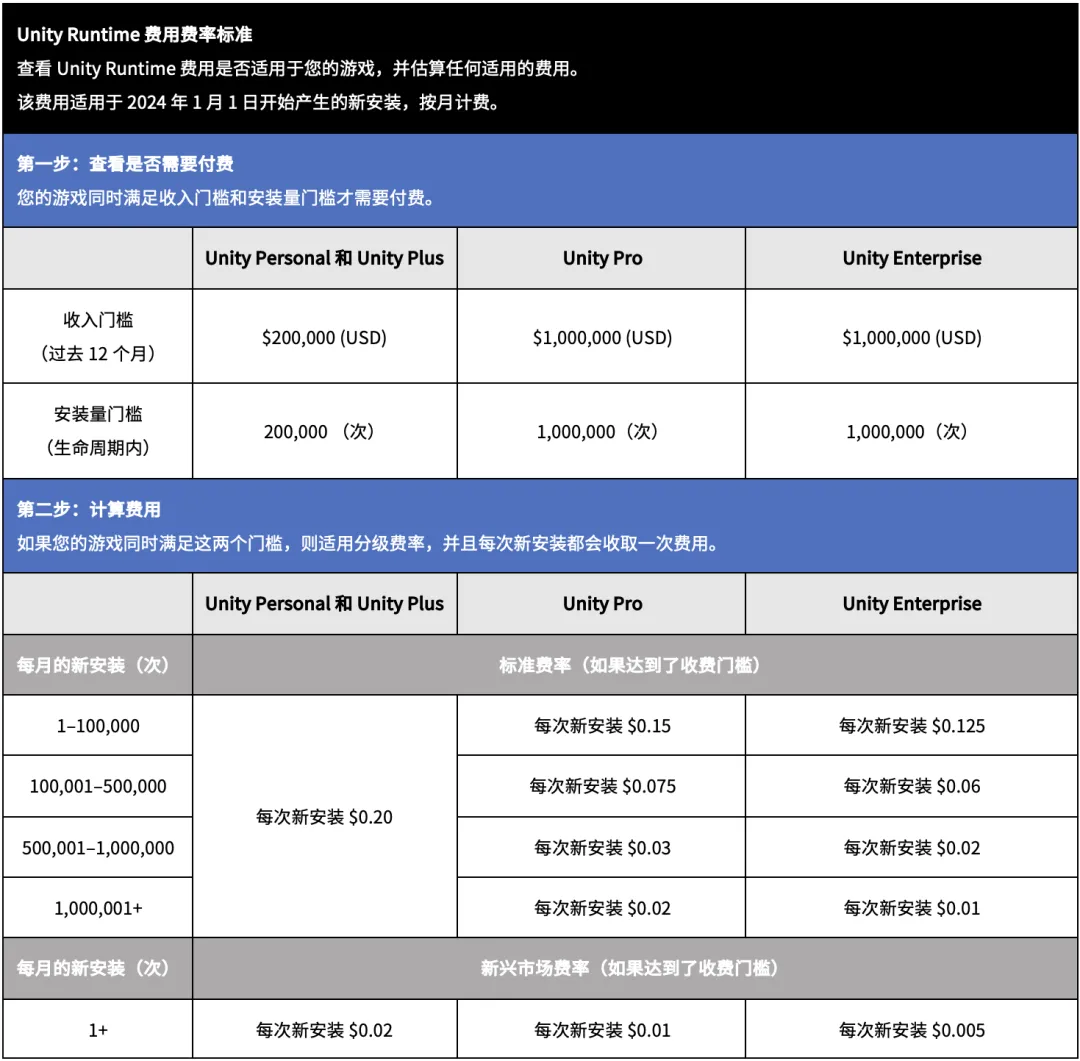 在具体的收费政策上,Unity表示,只有同时满足两个条件才会被收取Unity Runtime费用:游戏在过去12个月内超过了最低收入门槛、游戏超过了最低终身安装量。一旦同时满足安装量和收入的两个门槛,游戏厂商需要为 2024 年 1 月 1 日之后新产生的下载量支付 Runtime 费用。