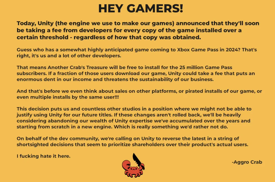 《蟹蟹寻宝奇遇》开发商 Aggro Crab发布声明称,如果这些变化不倒退,将认真考虑放弃多年来积累的大量Unity专业知识,在新引擎中从头开始。“我代表开发社区,呼吁Unity扭转一系列短视决策。”上述开发商认为,Unity的这些决策似乎优先考虑股东而不是其产品的实际用户。