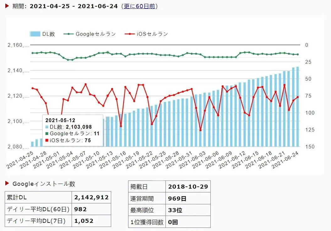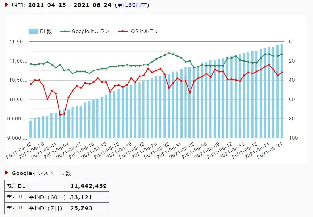 2020年,《末日喧嚣》一经上线就在日本取得双榜第一的成绩。运营将近一年以来保持着平稳的上升趋势,下载量稳步增高。Google Play日本区域畅销榜近60日内维持在TOP30,最高拿下第12名;日区App Store畅销榜排名总体呈上升趋势,最高拿下第24名。
