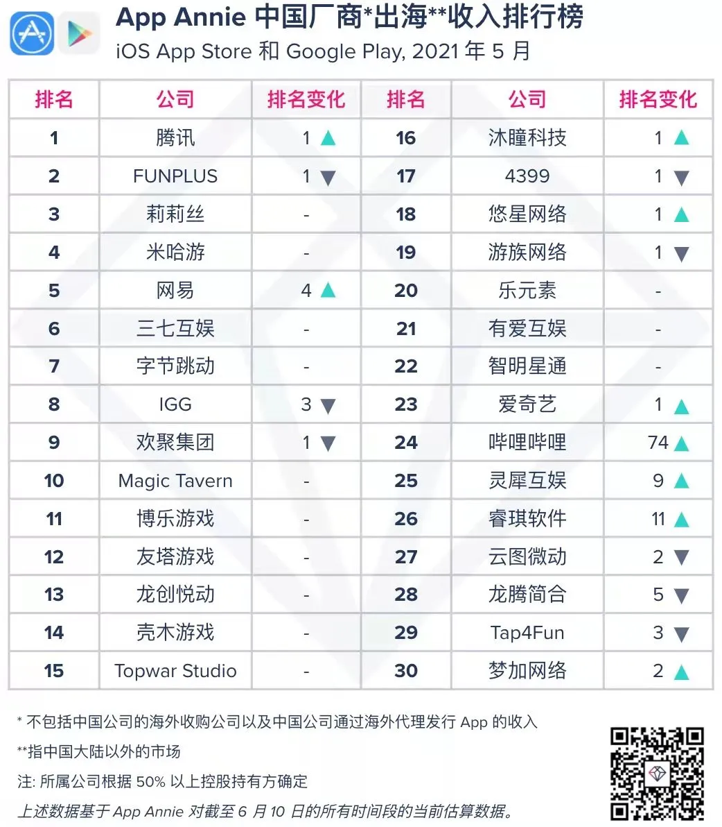 根据三七互娱公布的2021年第一季度财报显示,第一季度公司海外整体月流水超5亿元。同时,App Annie数据显示,2021年5月中国厂商出海收入排行榜中,三七互娱继续保持第6的位置。