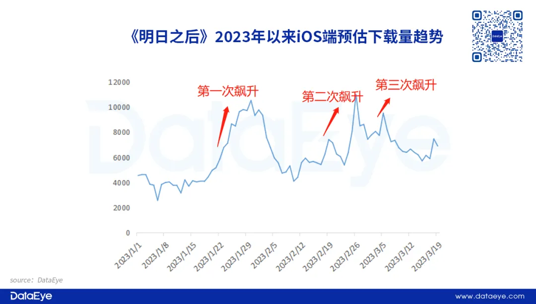 DataEye研究院参考了内部预估下载数据,以及data ai、七麦数据、点点数据等数据,我们发现,进入2023年《明日之后》一共出现三次下载量飙升。