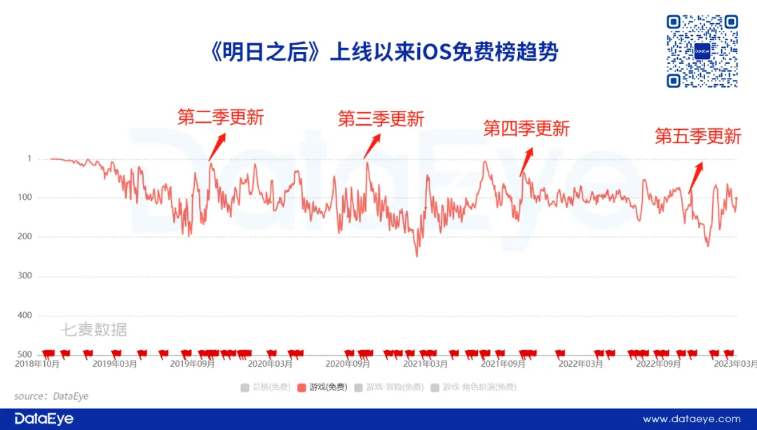 具体到数据表现上,也得到了一定程度上的印证、根据iOS免费榜排名,《明日之后》自上线以来,基本没有掉出过免费榜TOP200,而每次大版本更新之后,免费榜拉升较为明显,特别在前两次版本更新后都能重回免费榜TOP10。