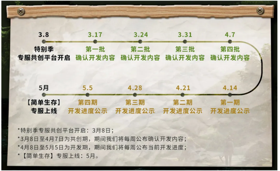 根据计划表,共创特别季计划将会分为三个阶段推进。目前正在筹备首个特别季主题“简单生存”,目前正处于“确认开发内容”阶段。