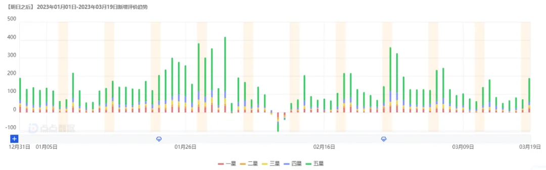 实际上,《明日之后》共创特别季计划是有迹可循的。以点点数据iOS端评分数据显示,2023年以来,《明日之后》用户评论表现活跃,单日新增评分评论可以突破400条。