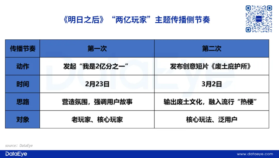 根据DataEye研究院观察《明日之后》在官宣2亿用户规模之后,围绕“2亿玩家主题”,传播侧有两个重要动作: