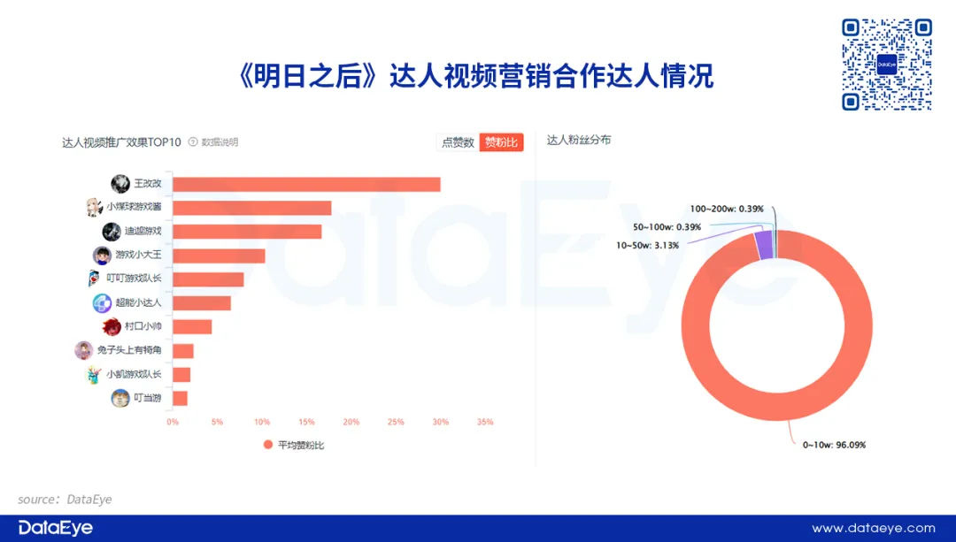 从合作达人分析数据来看,目前《明日之后》在抖音合作达人粉赞比TOP10的达人中,有8名达人近90天内推广过不止一款游戏,基本属于“职业游戏发行人”。而在达人分布上,0-10W粉丝的中腰部达人占比高达96%。