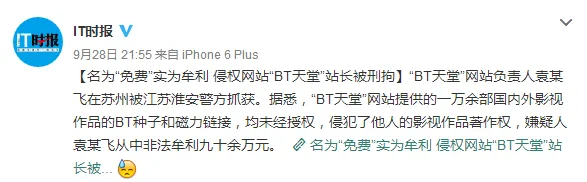 昨夜晚9点,挨踢妹收到消息,“BT天堂”网站负责人袁某飞被抓了!