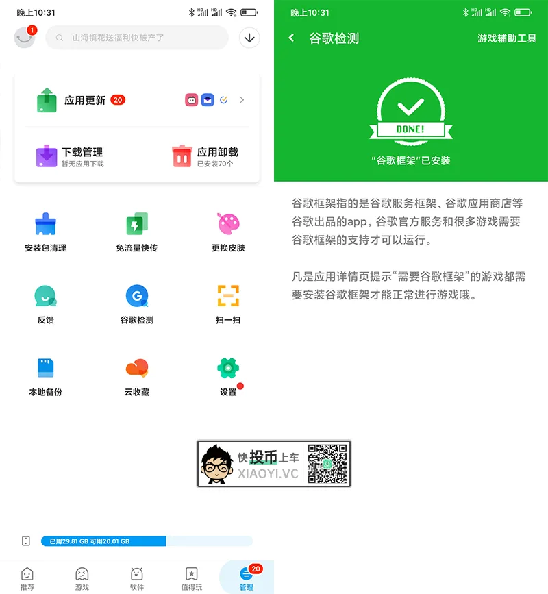功能方面支持免流量快传文件、谷歌框架检测、本地备份应用、登录账号后可以云收藏。