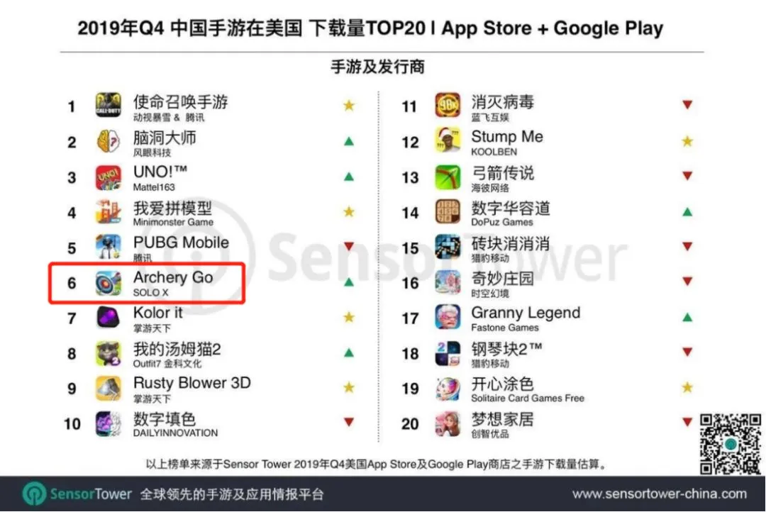 在全球最大手游市场之一美国,Archery Go分别挺进App Store及Google Play的单日游戏下载榜的前10及前15。2019年12月,该款游戏在美国的平均打开率为93%,平均美国单日用户时长超过30分钟。在评分方面,Archery Go的数据也较为突出。目前,Archery Go在App Store中的总评级为4.7分。在这样的下载量级下,这一评分印证了全球用户对这款游戏的认可。Archery Go的开发商为去年上市的出海企业“赤子城科技”,Solo X为其旗下产品矩阵。赤子城科技2013年开始出海,是国内最早的互联网出海企业之一,曾开发明星产品Solo Launcher等。赤子城科技打造了产品矩阵Solo X、广告平台Solo Math及人工智能引擎Solo Aware,构成全球流量生态平台。游戏业务为其流量生态业务的细分领域之一,也是其近年来重点发力的方向。出海圈对赤子城科技的名字都不陌生。这家公司在2013年就打造了风靡美国的极简桌面Solo Launcher,此后还推出过Solo Locker等亿级用户产品。这家公司也是Google Play最早认证的一批“顶尖开发者”之一。以工具起家的赤子城科技,近几年来不断尝试新的产品类型,开始向游戏、音乐、健身等内容型产品方向延伸。