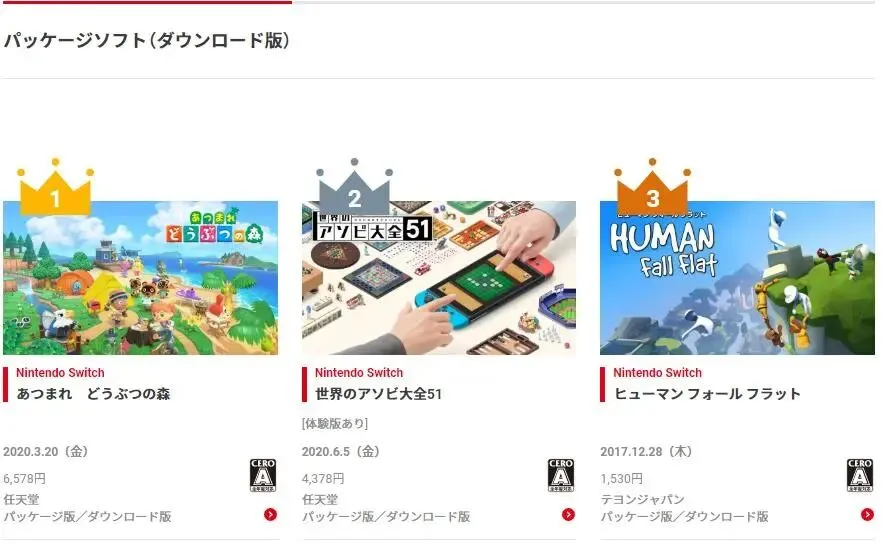 在实体游戏下载榜单中,年初大火的《集合啦!动物森友会》不出意外的登顶排在首位,位于第二的为最近刚刚在Switch发售的《世界游戏大全51》,知名动作解谜游戏《人类一败涂地》排名第三。值得一提的是,《人类一败涂地》2017年便登上Switch,如今依旧能够位于下载榜前列,可见Switch玩家对其十分喜爱。