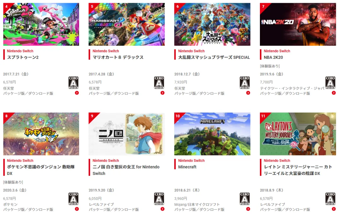 此外,在本次任天堂公布的榜单中,竞技类游戏的数量较少,比如知名游戏《堡垒之夜》、《王者荣耀》等都有Switch版本,不过均未出现在下载榜前列,可以见得,竞技游戏在Switch平台的表现并不理想。
