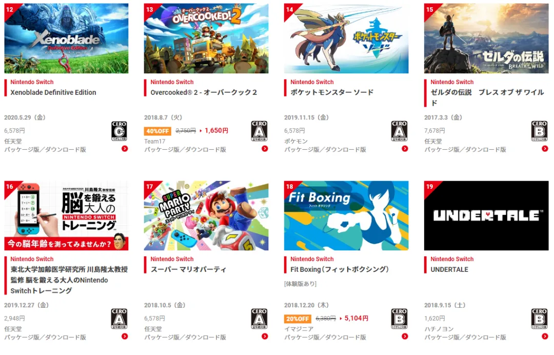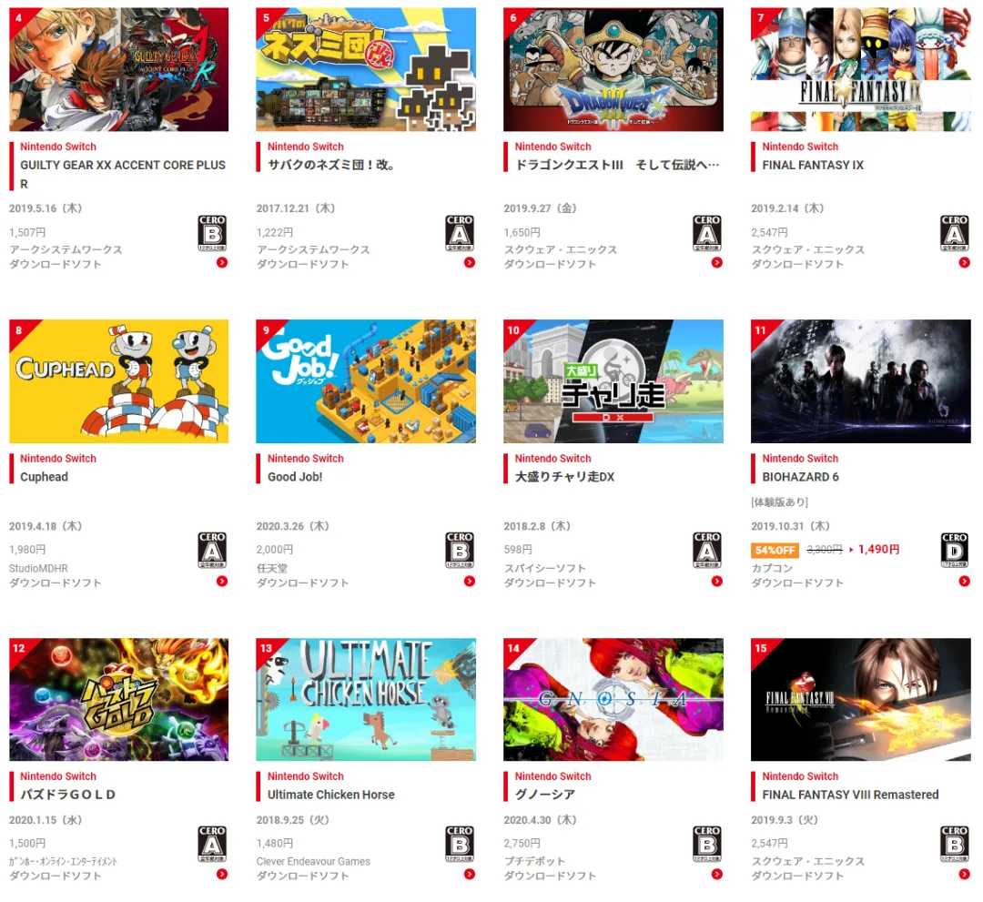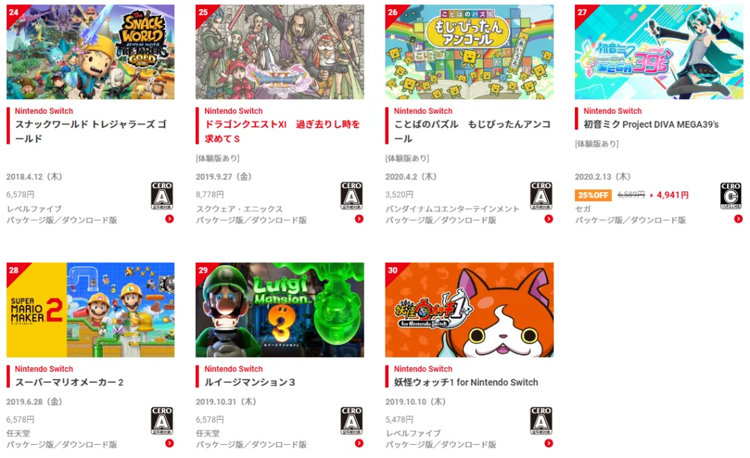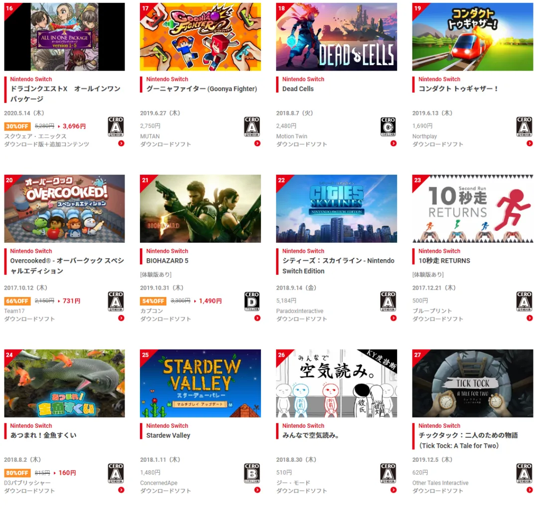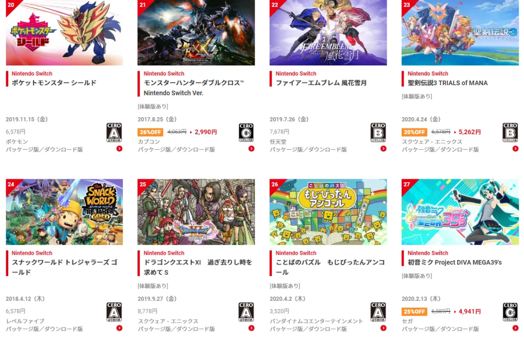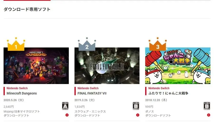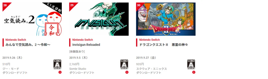在数字版榜单中,第三方游戏较多,且游戏售价上相比实体榜单的游戏普遍便宜很多,大部分都处于500~2500日元(约30~160人民币)间,其中最便宜的游戏仅售160日元(约人民币10元)。