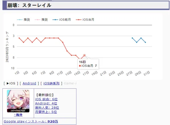 提到4月底5月最火的手游,就要属米哈游的《崩坏:星穹铁道》,4月23日商店的预下载开启之后,就获得了第一名的好成绩。4月26日正式上线之后也取得了前十的成绩。