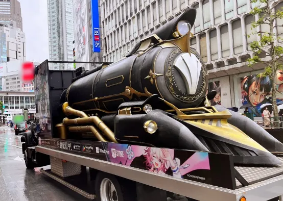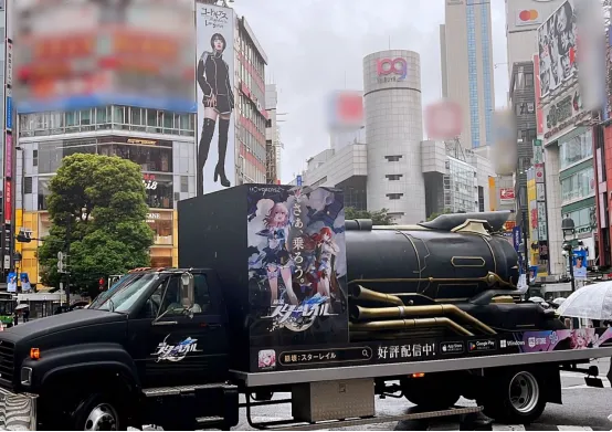 除了固定的广告位,《崩坏:星穹铁道》还购买了在东京市区内的移动广告位,为此还制作了游戏的火车头,类似这类移动的广告位,在游戏的宣传中也是比较常见的。