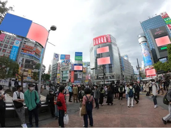 涉谷的广告位,位于忠犬八公前面的交叉路口,有5块大型电子屏,支持同时放映。