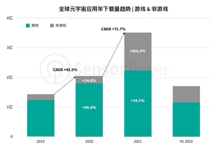近两年产业圈、科技圈等领域最火爆的话题,非元宇宙莫属,而且它甚至还成功“出圈”,渗透到各行各业,无数不清楚的人想破头要搞清楚,搞清楚的人又强烈地想要参与其中。近日,Sensor Tower发布了《元宇宙概念下的移动游戏市场洞察》,报告中表示,随着新冠疫情对全球用户非接触生活方式的推动,元宇宙概念再一次成为市场增长热点。整个2020年,全球元宇宙应用下载成功突破2亿,进入到2021年这一数据同比增长71.7%,而2022年上半年,元宇宙应用就已经获得了1.7亿下载,其中游戏应用下载量高达1.1亿,占比67.3%。