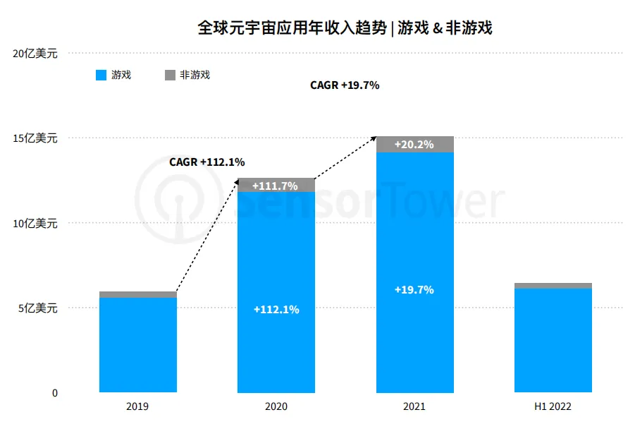 而在营收方面,元宇宙游戏确实极具商业价值。近年来,元宇宙应用年收入始终保持增长趋势,2020年突破了12.6亿美元,到了2021年则达到了有史以来峰值15.1亿美元。整个2022年上半年,元宇宙应用共营收6.5亿美元,其中游戏应用营收占比高达94%。