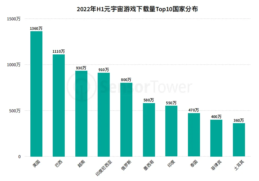 从地区方面着眼,美国作为最接受元宇宙概念的国家,其元宇宙相关游戏的下载量自2019年开始就始终一骑绝尘,整个2022年上半年,美国市场元宇宙游戏下载量近1400万,而在营收方面,更是超过了3亿美元,市场份额超48%,让后面的市场和地区望尘莫及。在元宇宙游戏下载量Top5中,除榜首美国外,余下的Top2-Top5分别是巴西、越南、印尼和俄罗斯,这些市场和地区2022年的下载量增长显著,有望成为下一个市场风口。