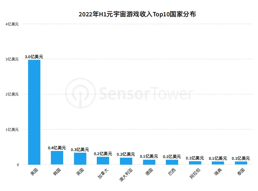 而收入的Top2-Top5分别是韩国、英国、加拿大和澳大利亚,其中韩国市场表现最为亮眼,收入超过4000万美元。韩国对于元宇宙概念接受度极高,目前甚至形成了初步的政府引领、民间主导、各大企业开拓、偶像工业驱动的相关产业,甚至韩国计划在2026年成为元宇宙大国。虽然很多人指出目前韩国的元宇宙产业仍处在资本炒作阶段,但这也一定程度上反映了元宇宙在韩国传播之广。