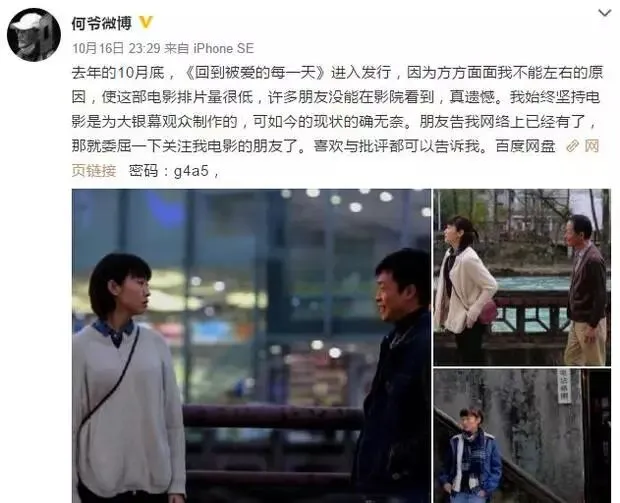 10月16日晚,导演何平突然在个人微博上分享了其去年上映的作品《回到被爱的每一天》的网盘链接,并表示:“去年的10月底,《回到被爱的每一天》进入发行,因为方方面面我不能左右的原因,使这部电影排片量很低,许多朋友没能在影院看到,真遗憾。我始终坚持电影是为大银幕观众制作的,可如今的现状的确无奈。朋友告我网络上已经有了,那就委屈一下关注我电影的朋友了。喜欢与批评都可以告诉我。”这条微博也引发了业内人士与网友的热烈讨论。