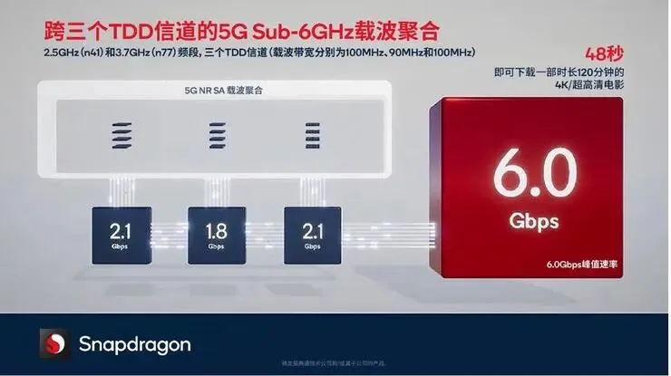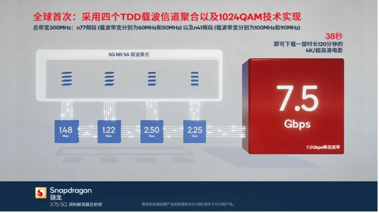 “要将一部2小时的4K电影下载速度提升10秒,需要分几步?”大部分人应该会摇摇头,5G的高速网络,让下载电影的机会越来越少。既然如此,领先的无线通信公司高通为什么还要为了提升10秒的电影下载速度突破5G性能的边界?高通最近创造的新世界纪录,基于2023年2月发布的最新骁龙X75调制解调器及射频系统,在Sub-6GHz频段实现了高达7.5Gbps的下行传输速度。7.5Gbps是个什么概念?下载一部2小时的4K超清电影的时间只需要38秒,也就是半分多钟。相比高通的上一代产品,同样在Sub-6GHz频段,下载电影的速度需要48秒(6Gbps)。高通创造5G Sub-6GHz频段下载的世界新纪录,当然不只是为了将电影下载速度提升10秒,更快的下载速度使得对数据连接要求更高的应用(如在线游戏)也能从中受益。视频和游戏之外的众多应用,也需要极速的5G连接速度。如何创下5G Sub-6GHz频段全球最快下行速率的纪录?