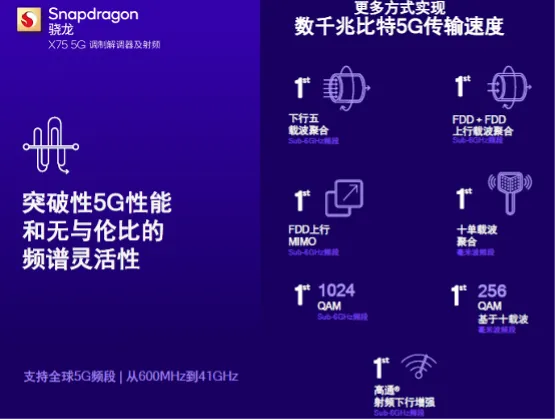 骁龙X70跨三个TDD信道载波聚合实现高达6Gbps2016年高通发布的首款5G调试解调器及射频系统骁龙X50,下行速率的理论峰值可以达到5Gbps,是千兆级水平。固定宽带的速率从2000年的窄带(64Kbps)、宽带(1Mbps),发展2005年的超宽带(30-200Mbps)、超百兆(100-500Mbps),再到2020年左右的千兆超宽(1Gbps-5Gbps)时代,如今固定宽带正在向万兆(10Gbps)的方向发展。三年前高通推出的骁龙X65 5G调制解调器及射频系统,就首次实现了10Gbps的峰值速率。让无线通信的速度从2010年4G商用之初的百兆,到2021年5G商用两年多时的万兆,11年时间将移动通信的速率提升了百倍之多。对于5G速率的追求,并非一味求快,而是要符合产业发展的需求。骁龙X65的下一代产品骁龙X70,下行峰值速率稳定保持在10Gbps,最新的骁龙X75发布之初,高通没有特别强调其峰值速率。高通技术公司高级副总裁兼技术、规划和边缘解决方案业务总经理马德嘉表示,“我们关注的重点是平均数据传输速率的提升,以及更加灵活地实现更高的峰值数据传输速率,而并不是只谈论峰值速率。”骁龙X75在提升平均数据传速率以及更灵活实现更高峰值速率方面也进行了大量突破性工作。在Sub-6GHz频段,骁龙X75首次支持下行五载波聚合、FDD+FDD上行载波聚合以及FDD上行MIMO,支持更高阶的1024QAM。在毫米波频段,骁龙X75支持十单载波聚合,并支持基于十载波的256QAM。结合高通最近创造的Sub-6GHz下行速率纪录,可以看出,骁龙X75还未发挥出全部实力,根据行业需求,骁龙X75在未来还可以进一步释放出更强大的性能。灵活性在5G时代也尤为关键,在5G发展初期全球就出现了超过1万个频谱组合。骁龙X75支持从600MHz到7GHz的Sub-6GHz频段,以及从24GHz至41GHz的毫米波频段,能够满足电信运营商对灵活性的需求。“这样一来,不论运营商采用哪种频段以及频段组合,我们都能够助力运营商以更灵活的方式实现更高的峰值数据传输速率。”马德嘉表示。这只是骁龙X75调制解调器及射频系统10项创新中的一部分。AI是骁龙X75众多创新中尤为值得关注的特性。骁龙X75是首个采用专用硬件张量加速器(第二代高通5G AI处理器)的调制解调器及射频系统。第二代高通5G AI处理器的AI性能是第一代的2.5倍以上,结合第二代高通5G AI套件,能够实现更高的连接速度、移动性、链路稳健性和定位精度以及更广的网络覆盖,这些都与使用者的体验密切相关。要说用户体验,骁龙X75 5G调制解调器及射频系统的第二代双卡双通(DSDA),一定能让手游爱好者、普通职场人爱不释手。第二代高通双卡双通,实现了两张SIM卡都能支持最新的5G网络,还能同时连接至两个蜂窝网络或者同时使用语音。这让游戏玩家再也不用担心突然打来的电话导致游戏断线,职场人也无需担心错过重要的电话。另外,骁龙X75在延长电池续航、卫星通信、AI增强定位精度等方面都进行了创新,这得益于专为可扩展性打造的全新调制解调器到天线的可升级架构。如此多的技术创新,高通显然不是只为了提升5G的速率,或者为了下载电影的速度快10秒,而是着眼于技术积累,为5G的创新和杀手级应用的出现打下坚实的基础。要问5G的杀手级应用是什么,所有人都还在期待,可能是XR,也可能是其它AI应用。可以明确的是,距离5G杀手级应用的出现已经越来越近。从2019年5G商用元年到2023年,按照一代移动通信10年的周期来看,我们已经迈入了5G-Advanced的时代。此时的5G技术已经更上一层楼,速度达到了固定宽带的万兆级,Sub-6GHz频段的速度再创纪录,更好的用户体验、更快的下载速度、更大的网络容量以及更高的频谱效率,都为5G杀手级应用的出现铺平了道路。这些成绩的取得,离不开5G标准的持续演进,整个行业的共同努力,也缺不了像高通这样的5G行业领军者。5G商用至今,高通是全球唯一一家每年迭代5G调制解调器的公司,这种持续不断的创新和突破,积累了大量的技术,也不断满足着业界对于5G网络的需求,引领5G技术的向前发展。正如骁龙X75 5G调制解调器及射频系统发布几周后,就有移远通信、广和通、美格智能等多家中国模组厂商推出搭载骁龙X75的5G模组,支持最新5G技术在广泛物联网细分领域的快速落地。5G-Advanced时代,也会迅速出现更多的5G应用创新,5G的杀手级应用也会加速到来。