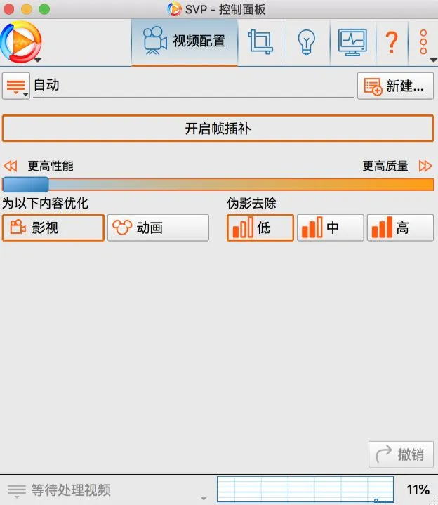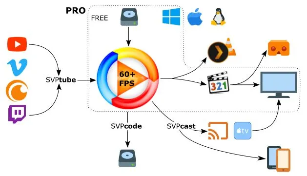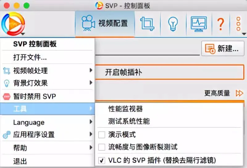 VLC 这个播放器无论是 Mac 还是 Windows 上都有,而且 SVP 也都支持。Mac 上的 SVP 4 就是把 VLC 里的去隔行滤镜替换成了它的 “ 补帧滤镜 ”