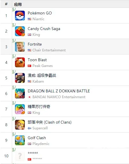 在App Store畅销榜上,排名前三的分别是《精灵宝可梦GO》、《糖果粉碎传奇》和《堡垒之夜》。《Toon Blast》名列第四,《漫威: 超级争霸战》排名第五,《龙族Z》位列第6。第七名是《糖果苏打传奇》,第八名是《部落冲突》,而《Golf Clash》名列第九。