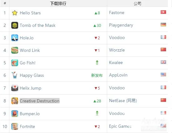下载榜上,异军突起的《Hello Star》成为下载冠军,这也是一款益智类、利用物理性质解决问题的休闲游戏,可以认为又是魔性玩法的小游戏。前面很火的《黑洞大作战》,已经被挤至第三了。下载榜前十中,国产游戏有字谜游戏《Word Link》和网易新吃鸡游戏《Creative Destruction》。