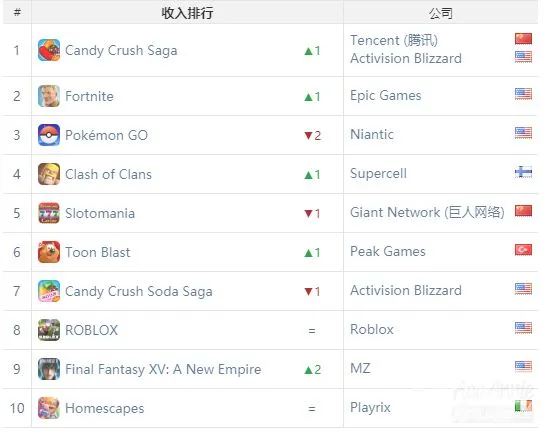 在8月收入榜上,没有出海游戏进入前十。收入榜排名前三的分别是《糖果粉碎传奇》、《堡垒之夜》和《精灵宝可梦GO》。巨人筹划巨资收购的Playtika旗下游戏《Slotomania》名列第五,这是一款娱乐城类游戏,在美国收入一直非常高。