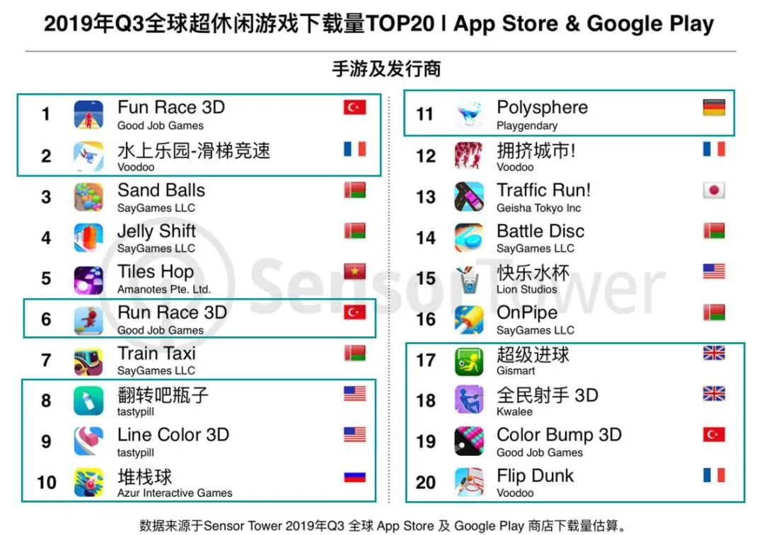 SayGames上榜数量最多,达到5款,分别是第3的《Sand Balls》、第4的《Jelly Shift》、第7的《Train Taxi》、第14的《Battle Disc》和第16的《OnPipe》。Good Job Games则有3款游戏上榜,分别是TOP1的《Fun Race 3D》、第6的《Run Race 3D》和第19的《Color Bump 3D》,均为3D游戏。