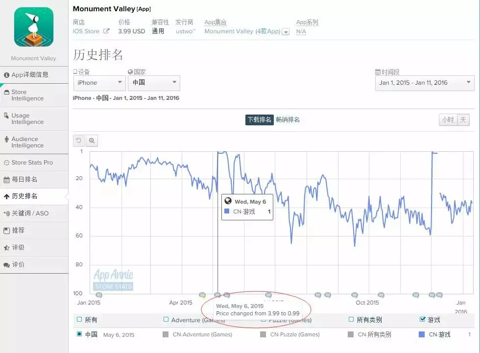 1月10日,《纪念碑谷》价格从4.99美元降至3.99美元,榜单排名从第18位逐渐升至第13位;