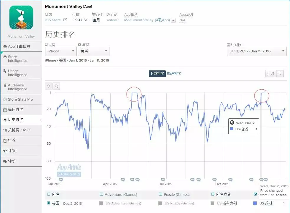 美国区榜单中《纪念碑谷》从2015.1.1到2016.1.11下载榜表现