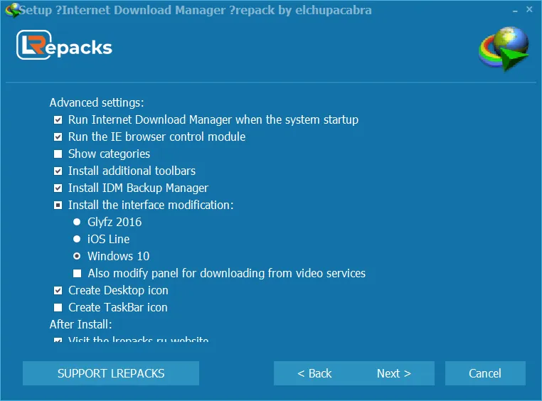 直到高级设置,按照下面图上设置。系统启动时运行Internet Download Manager、运行IE浏览器控制模块、安装其他工具栏、安装IDM备份管理器。