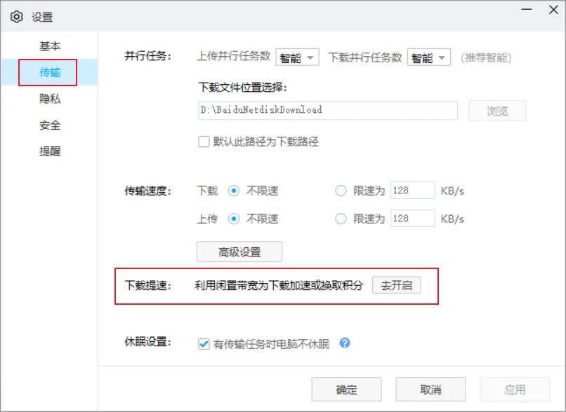 接着,选择「 传输 」,然后开启「 下载提速 」。