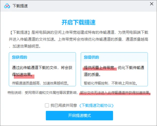 首先,下载速度并非是用户白嫖的,用户需要将闲置的上行带宽来换取这个加速效果。在开启功能前,会出现弹窗向大家说明。