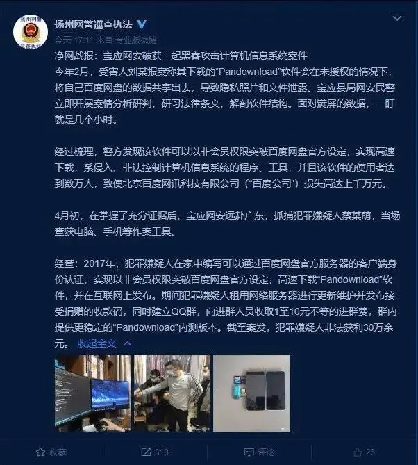很久没用百度网盘,没看懂前天微博热榜中的 PanDownload 是什么内容。直到昨天才知道是有个做百度网盘破解版的程序员被抓了。Pandownload 开发者被抓,获利 30 多万4 月 15 日晚间,Pandownload 话题登上微博热搜榜,只因其开发者已被抓。扬州网警巡查执法发布净网战报:宝应网安破获一起黑客攻击计算机信息系统案件今年 2 月,受害人刘某报案称其下载的“Pandownload"软件会在未授权的情况下,将自己百度网盘的数据共享出去,导致隐私照片和文件泄露。宝应县局网安民警立即开展案情分析研判,研习法律条文,解剖软件结构。面对满屏的数据,一盯就是几个小时。经过梳理,警方发现该软件可以以非会员权限突破百度网盘官方设定,实现高速下载,系侵入、非法控制计算机信息系统的程序、工具,并且该软件的使用者达到数万人,致使北京百度网讯科技有限公司(“百度公司”)损失高达上千万元。4 月初,在掌握了充分证据后,宝应网安远赴广东,抓捕犯罪嫌疑人蔡某萌,当场查获电脑、手机等作案工具。经查: 2017 年,犯罪嫌疑人在家中编写可以通过百度网盘官方服务器的客户端身份认证,实现以非会员权限突破百度网盘官方设定,高速下载“Pandownload"软件,并在互联网上发布。期间犯罪嫌疑人租用网络服务器进行更新维护并发布接受捐赠的收款码,同时建立QQ群,向进群人员收取 1~10 元不等的进群费,群内提供更稳定的 Pandownload 内测版本。截至案发,犯罪嫌疑人非法获利 30 万余元。