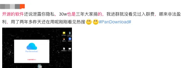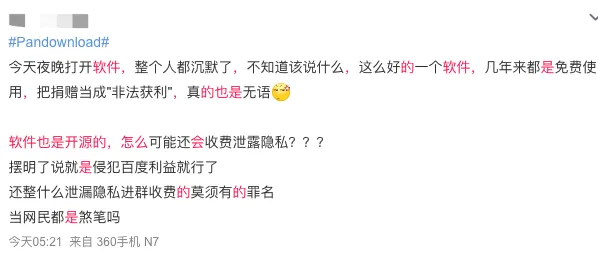 PanDownload 这个软件我没用过,不方便对其发表看法。微博上有人说「它是开源的,怎么会收费泄露隐私」…… 你们用过的,可以来发表观点。