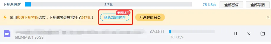 体验结束后,会出现一个「延长加速时间」的提示,这个就是单次 / 单日下载的入口了。