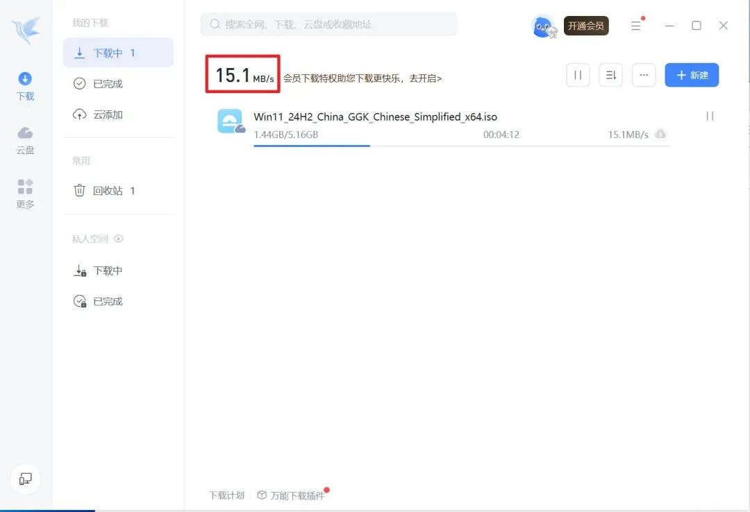 打开软件后需要登录账号,登录后能同步网盘里的资源,之前存在网盘里的文件,直接在软件里就能找到下载,不用再去网页端转存,省了不少事。我登录自己的账号试了下,网盘里的视频、文档都同步得清清楚楚,点一下 “下载”,进度条立马开始跑,几秒钟就冲到了 15.1M/S,我家网速本来不算快,这个速度已经快到让我惊喜了,下一个 2G 的电影,不到 3 分钟就完事儿,比之前用的限速版快了十几倍。