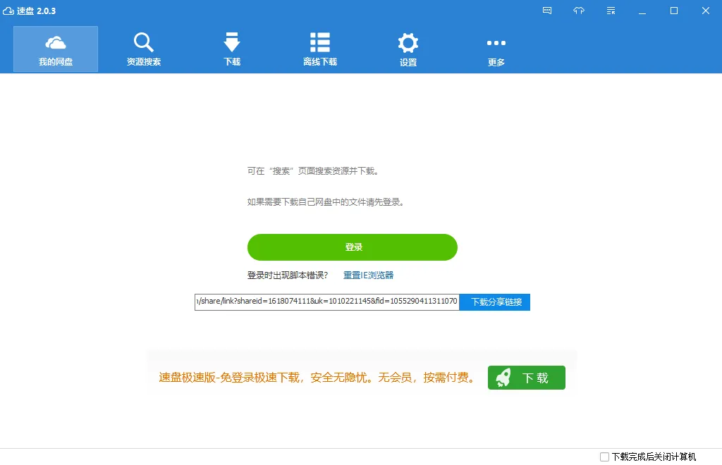 进入软件界面如下,可以登录自己的网盘,也可以使用分享链接直接下载。