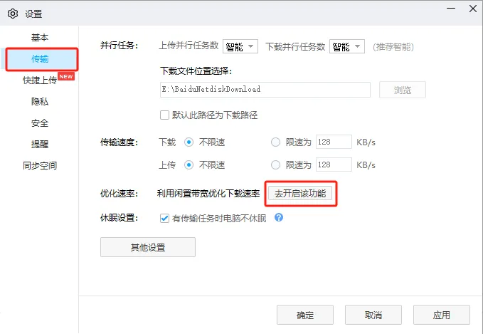 4、点击左的传输,在优化速率中点击去开启该功能;
